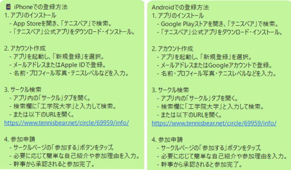 テニスベアサークル「工学院大学硬式テニス部OB・OGコミュニティ」への参加は、まずテニスベアアプリをインストールし、会員登録後にサークルページから「参加申請」を行う流れです。以下で iPhone用 と Android用 に分けて手順を整理しました。