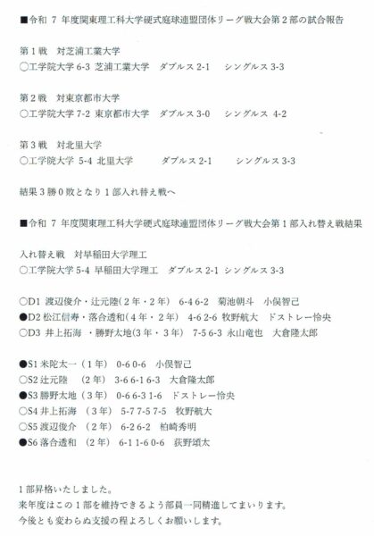 2026年3月8日 お知らせ 男子1部女子7部昇格報告会・お祝い会を開催いたしました。 3月8日工学院大学新宿校舎7階 A-0765教室にて、男子1部女子7部昇格報告会・お祝い会を無事終了いたしました。 oplus_2 今年度もリーク優勝を目指して、昇格リーグ維持に臨む学生を支援・応援致しましょう。